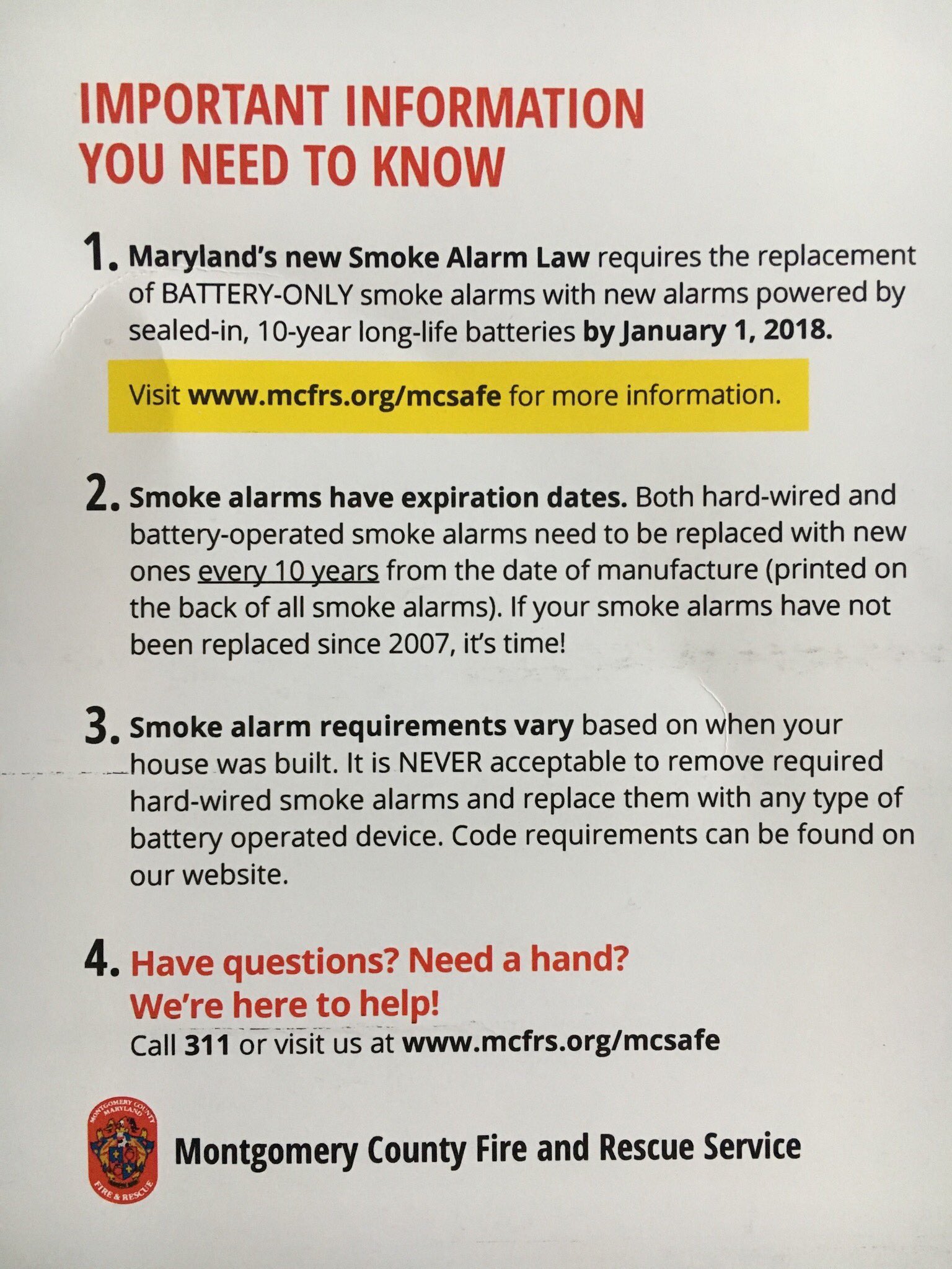 Maryland new smoke alarm law | baltimore city fire department. If your smoke detector is older than 10 years old, it needs to be changed. Because smoke alarm laws vary by state, this can be a confusing topic for landlord/tenant relationships. After 10 years, just replace the whole detector. According to the cdc, over 10,000 are poisoned by carbon monoxide needing medical treatment each year and the mandate varies from every enclosed room being required to have detectors, to every room that has a.